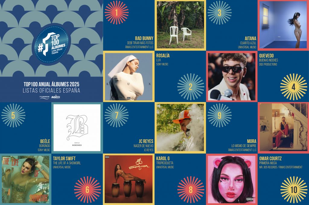 El Top 100 Álbumes anual de 2025 da cabida a una gran cantidad de géneros, artistas y lanzamientos en los rankings de éxitos de ventas en nuestro país, poniendo entre los 100 álbumes más vendidos a 51 trabajos discográficos de artistas españoles. La lista de 2025 de venta de álbumes está liderada en el puesto nº 1 por el puertorriqueño Bad Bunny y su trabajo “Debí tirar más fotos” (Rimas Entertainment LLC), mientras que el puesto nº 2 refleja sin duda el éxito rotundo de la española Rosalía que, con tan solo 7 semanas en listas, sitúa su disco “Lux” (Sony Music) en la segunda posición del Top 100 anual, a lo que se le suma que en la semana de su salida a la venta ya era Disco de Platino® (algo que también logró Taylor Swift con su trabajo “The life of a Showgirl” (Universal), obteniendo Disco de Platino® en la misma semana del lanzamiento y situándose en el nº 6 de la lista anual). El nº 3 es para Aitana, otra exitosa mujer española que con su álbum “Cuarto Azul” (Universal), alcanzó en la primera semana de salida a la venta el Discos de Oro®. Estos datos reflejan el gran éxito de estas 3 artistas en el Top anual de álbumes, ocupando posiciones de honor y recibiendo certificados en la misma semana del lanzamiento de sus discos. En el nº 4 se posiciona nuevamente un artista español, Quevedo, que se suma a la lista con su disco “Buenas noches¨(DQE Productions) y, cierra el top 5 el álbum, ¨Borondo” (Sony Music) del colombiano Beéle. Destaca también en el Top 10 el artista español JC Reyes con “Nacer de nuevo” (JC Reyes)