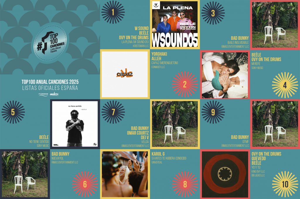En el Top 100 Canciones anual 2025, sigue destacándose el género urbano con W Sound / Beéle / Ovy on the Drums y su rotundo éxito “La Plena (W Sound 05)” (Kristoman LLC), que le ha valido la certificación de PROMUSICAE del séxtuple Disco de Platino® (que supone más de 600.000 unidades vendidas).