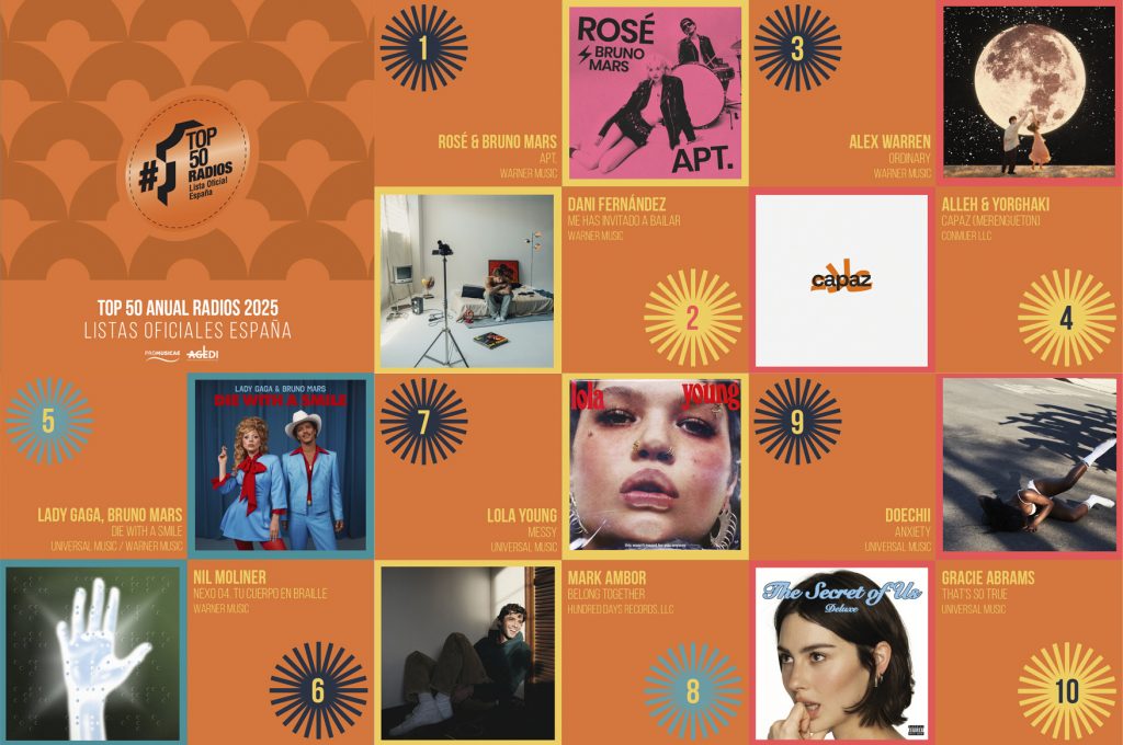 Por su parte, la canción más radiada en España en 2025 ha sido “APT.” (Warner Music) de la neozelandesa-surcoreana Rosé y el cantautor estadounidense Bruno Mars.
