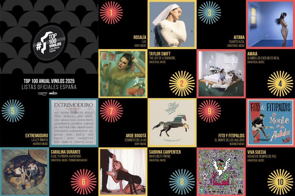 En lo que respecta a los artistas locales, nuevamente sobresale Rosalía con su disco “Lux” (Sony Music) en el puesto nº 1, mientras que su álbum anterior “Motomami” (Sony Music) obtiene el puesto 71; el segundo lugar del ranking de vinilos es para “The life of a Showgirl”(Universal) de Taylor Swift y el nº 3 y el n º4 nuevamente lo ocupan mujeres españolas con Aitana con su disco “Cuarto Azul” (Universal) y Amaia con “Si abro los ojos no es real” (Universal); por su parte, Extremoduro y Robe se hacen inmortales en la música a través de sus discos “La Ley Innata”, “Yo, minoría absoluta”, “Agila”, “Grandes éxitos y fracasos”, “Material defectuoso”, “Pedrá”, “Rock transgresivo”, “Canciones prohibidas” e “Iros todos a tomar por culo” (todos de Warner Music) de Extremoduro y “ Se nos Lleva el aire” de Robe (El Dromedario Records).