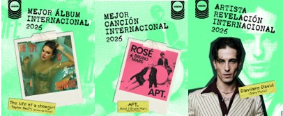 La lista de premiados se cierra con la mundialmente reconocida Taylor Swift, que recibe un año más el premio a mejor álbum internacional con The Life of a Show Girl (Universal Music); APT. (Warner Music) de Rosé y Bruno Mars, se alza con el premio a la mejor canción internacional; y el cantante y compositor Damiano David se convierte en el artista revelación internacional, en su faceta como solista.