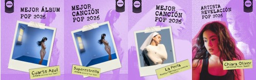 Pasando a las categorías por género, en pop las mujeres han estado al frente de los trabajos que más han destacado en 2025 son Cuarto Azul (Universal Music Spain), de Aitana, que ha conseguido alzarse como el mejor álbum pop 2026 así como con el de mejor canción pop para Superestrella (Universal Music Spain), premio que comparte ex aequo con La Perla (Sony Music) de Rosalía y Yahritza y su esencia; la joven menorquina Chiara Oliver se hace con el trofeo a Artista revelación pop 2025.